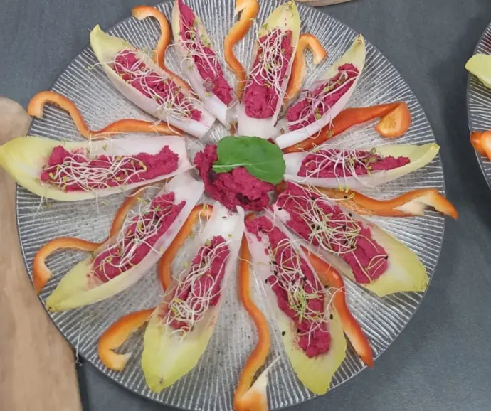 - Mixez au robot les pois chiches, les betteraves, le tahin, le citron avec la pulpe, l’ail, le cumin, la coriandre, le Pianto et ajoutez l’eau nécessaire.