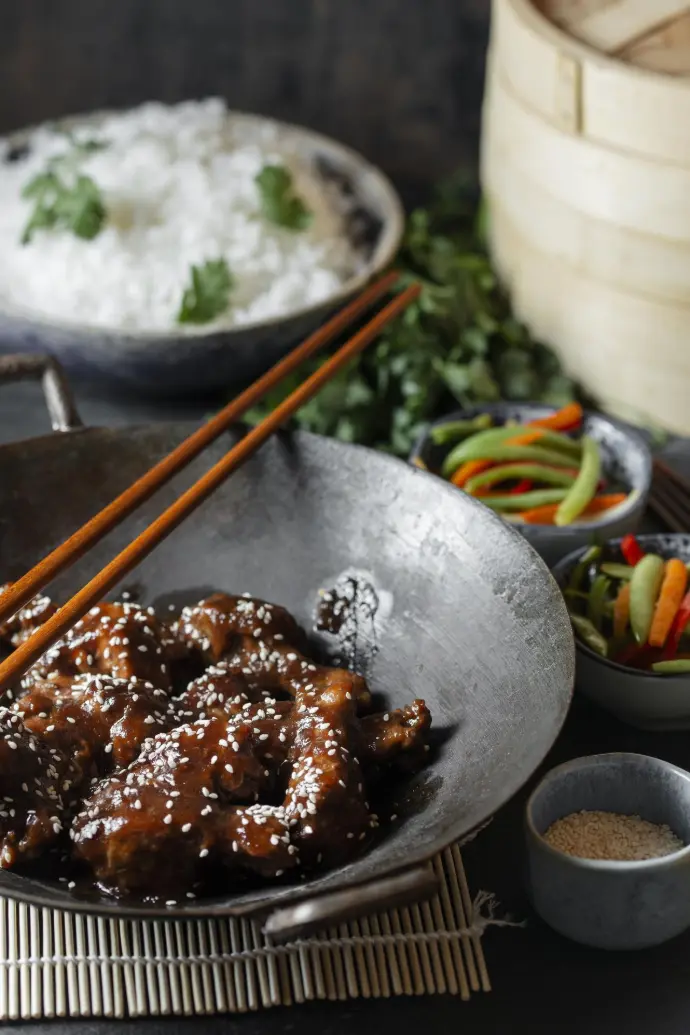 - Remettre le poulet dans la poêle, bien mélanger pour enrober de sauce, et terminer la cuisson pendant 1 à 2 minutes.